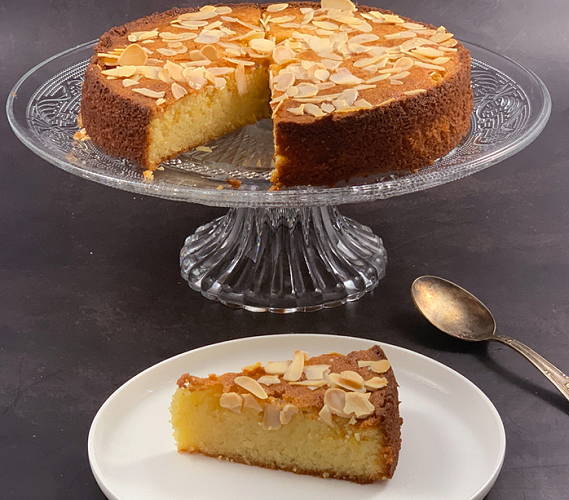 160°C. Faire cuire 40 min environ. Parsemer de quelques amandes effilées, d’amandes brutes et de sucre glace.