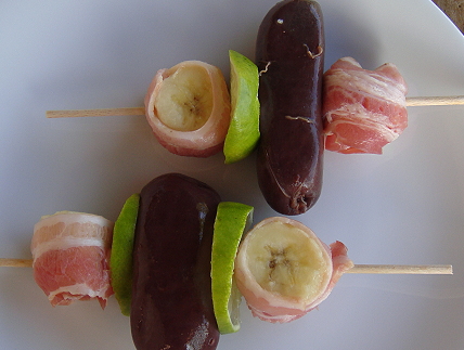 Couper les bananes en tranches épaisses et les arroser de jus de citron vert. Les enrouler avec une demi tranche de poitrine fumée. Piquer les boudins antillais sur les brochettes en alternant avec les tranches de bananes et de fines tranches de citron vert. Faire cuire au barbecue ou sous le gril du four pendant 6 à 8 mn en les retournant à deux reprises.