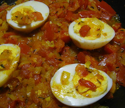 PREPARATION : Faire cuire les oeufs pendant 10 mn ; laisser refroidir et enlever la coquille. Les couper en deux dans le sens de la longueur. Eplucher et émincer l'oignon et l'ail. Hacher les tomates. Faire revenir l'oignon dans l'huile. (3 mn) Ajouter le curcuma, l'ail, le thym puis les tomates. Mélanger et couvrir. Laisser mijoter 5 mn à feu moyen. Ajouter les oeufs et mélanger délicatement. Poursuivre la cuisson quelques minutes à feu doux, le temps de réchauffer les oeufs.