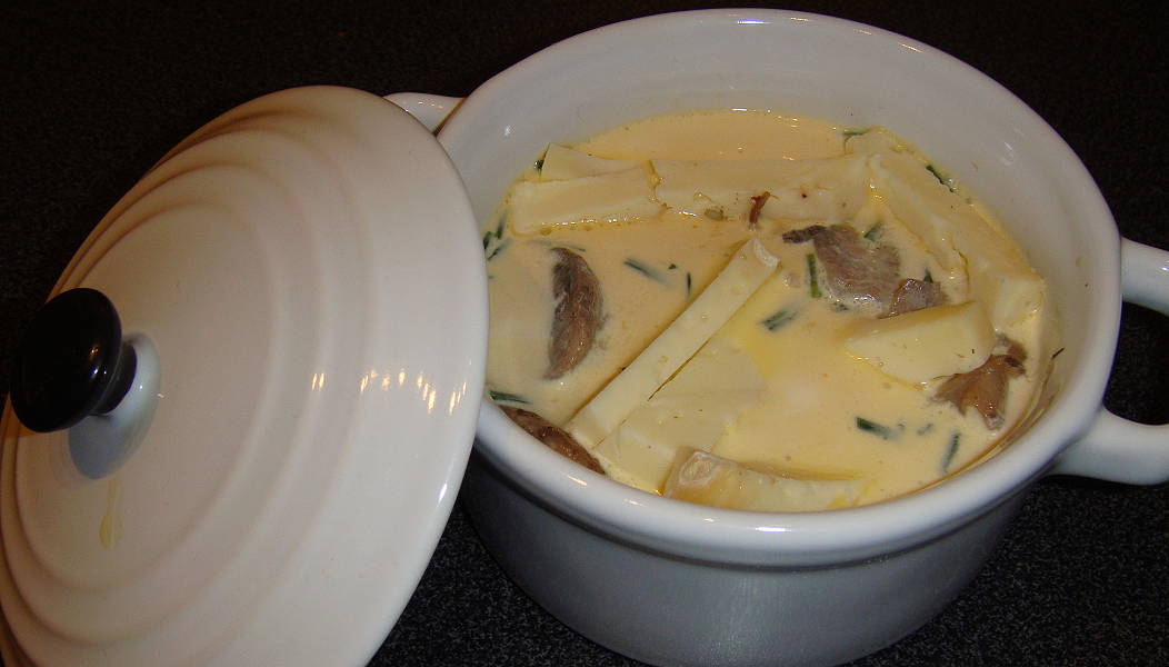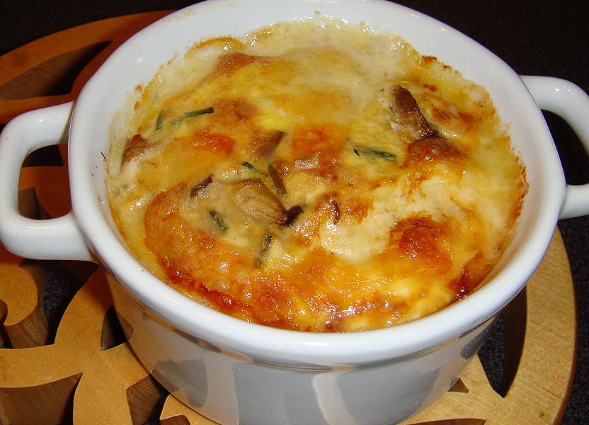 PREPARATION : Nettoyer les champignons et les couper en lamelles. Dans une poêle, faire fondre 25 g de beurre et faire revenir les champignons jusqu'à ce qu'ils aient perdu leur eau. Ecrouter le tome et la couper en fines tranches. Laver et hacher finement la ciboulette; Casser les oeufs et les battre. Ajouter la muscade, la crème, la ciboulette. Saler, poivrer. Mélanger. Beurrer l'intérieur de chaque ramequin et répartir les champignons. Verser dessus la préparation aux oeufs. Recouvrir avec la tome. Enfourner 30 mn au bain-marie th 180°. Servir chaud.