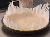 Technique : Pour cuire à blanc un fond de pâte, commencer par préparer tout le matériel. Après avoir foncé un cercle ou un plat à tarte de pâte (brisée, sucrée, sablée..), disposer sur la pâte une feuille de papier sulfurisé.