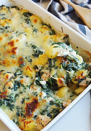 Gratin de gnocchis à la truite fumée et aux épinards