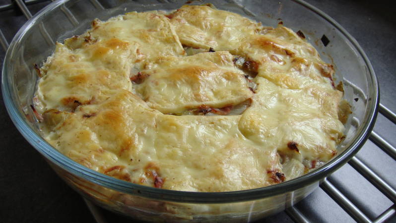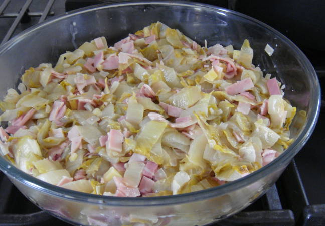 Préparation : Laver les endives et les couper en lamelles. Dans une poêle, avec l'échalote, les faire braiser à feu doux dans un peu de margarine. Saler, poivrer. Les laisser s'égoutter une demi heure dans une passoire. Dans un plat à gratin, mélanger les endives, le jambon coupé en lamelles, la raclette coupée en morceaux et la crème. Faire gratiner sous le grill pendant 5 - 10 mn.