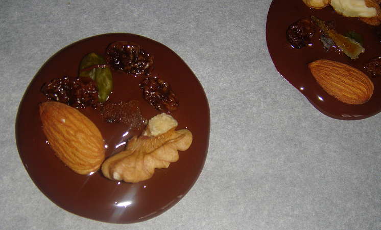 PREPARATION : Concasser le chocolat et le faire fondre au bain-marie. Sur une grande feuille de papier sulfurisé, déposer 2 bonnes cuillères de chocolat fondu, bien espacées. Aussitôt placer les fruits secs dessus. Laisser prendre au frais. Conserver ces mendiants dans une boite hermétique au frais mais pas au réfrigérateur.