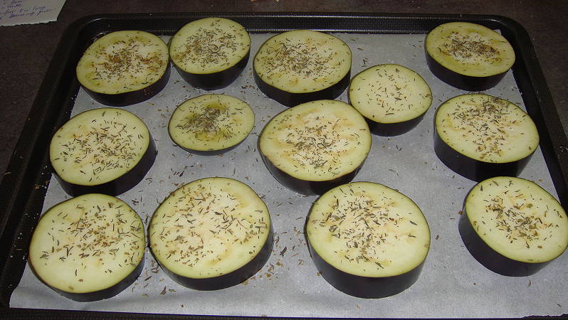 Préparation : Laver les aubergines et les couper en rondelles épaisses. Déposer les rondelles sur une plaque à four recouverte d'un papier sulfurisé. Saler et saupoudrer d'herbes de Provence ou d'un mélange de thym et de laurier. Faire cuire dans un four préchauffé à 180° pendant 30 mn. Vérifier la cuisson : l'aubergine doit être moelleuse.