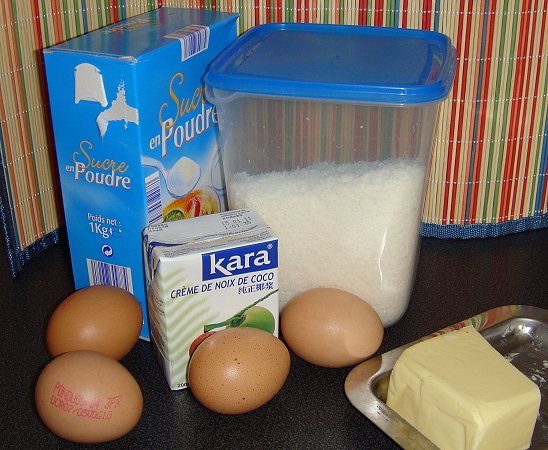 Préparation : Préchauffer le four th 180°. Mettre le sucre et les oeufs dans un saladier. Battre le tout jusqu'à ce que le mélange blanchisse. Incorporer la noix de coco râpée, la crème de coco puis le beurre fondu. Le mélange doit être homogène. Beurrer de petits moules, ronds ou rectangulaires et verser la préparation au 3/4 de la hauteur. Mettre au four pendant 30 mn. Démouler froid. Accompagner d'une salade de fruits : mangue, kiwi, ananas... un délice.