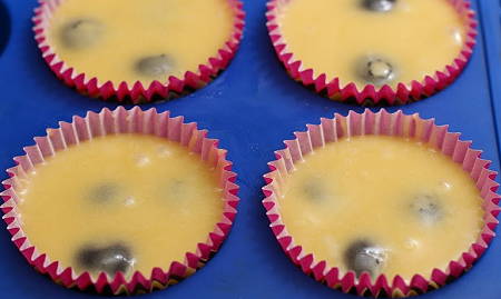 Suivant la recette choisie, ajouter les myrtilles ou le cacao ou les pépites de chocolat. Insérer les caissettes dans les cavités d'un moule à muffins et remplir quasiment jusqu'en haut. Enfourner pour 35 mn.