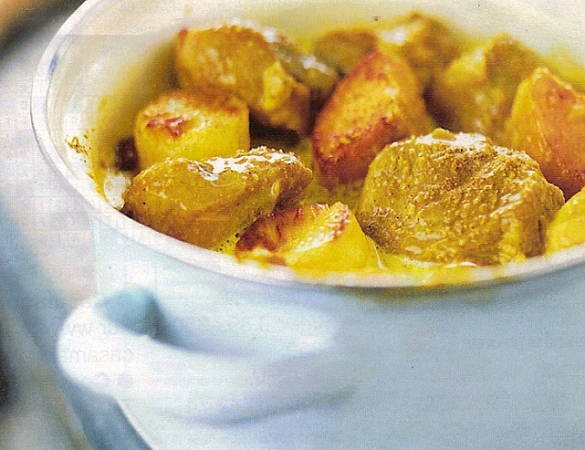 Les patates douces : Eplucher et couper les patates douces en cubes. Dans la poêle, ajouter un peu de beurre et faire dorer les patates douces. Baisser le feu, couvrir et poursuivre la cuisson à feu très doux pendant 15 mn en les retournant régulièrement.