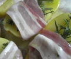 Même recette en ajoutant de fines tranches de poitrine fumée. Après avoir enrobé les pommes de terre dans les herbes, les enrouler dans la poitrine fumée.
