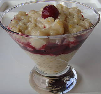 PRESENTATION : Dans une verrine : Au fond, 1 couche de riz puis des fruits rouges en compote : cerises, fraises, framboises ou une compote de pommes ou poires ou un coulis de pêches ou d'abricot avec quelques morceaux et une couche de riz Servir bien froid avec une crème fouettée ou de la crème anglaise ou un coulis.