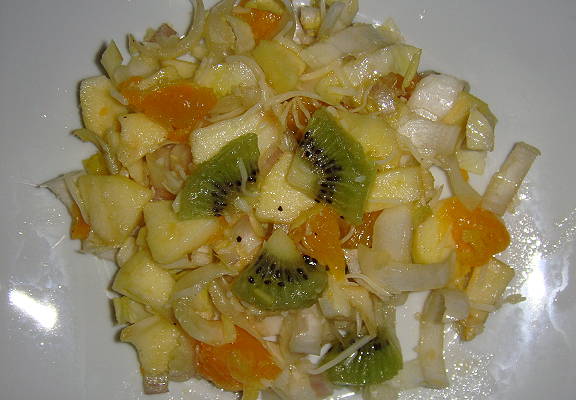 Préparation : Nettoyer et couper l'endive en fines tranches. Couper les fruits et l'échalote en petits cubes. Réunir tous les ingrédients dans un saladier. Verser l'huile d'olive et le filet de citron, saler, poivrer.