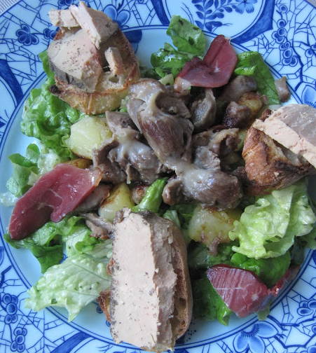 Faire cuire les pommes de terre épluchées et détaillées en cubes à la vapeur. Préparer la vinaigrette et la salade. Couper de petites tranches de baguette et les faire griller au four. Couper le foie gras. Faire dorer les gésiers confits et les pommes de terre dans un peu de graisse des gésiers. Dresser l'assiette avec la salade assaisonnée, ajouter les gésiers et les pommes de terre, les tranches de magret et les tartines de foie gras. Saupoudrer de ciboulette