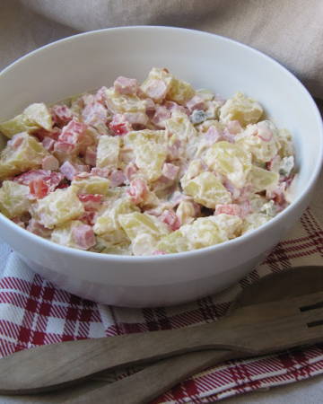 PREPARATION Faire cuire les pommes de terre à l 'eau avec la peau. Les peler lorsqu'elles sont refroidies et les couper en morceaux. Les déposer dans un saladier. Ajouter les dés de jambon, les radis et les cornichons émincés ainsi que la tomate détaillée en dés. Préparer une mayonnaise maison. Mélanger délicatement le tout et réserver au frais avant de servir. On peut ajouter 3 oeufs durs mais surtout de la ciboulette.