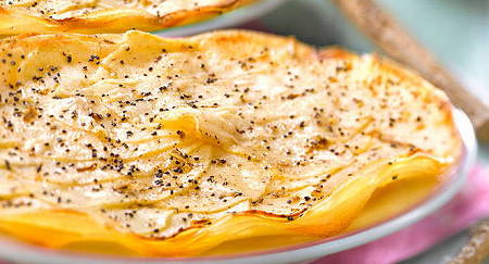 Eplucher les pommes et les couper en tranches fines. Préchauffer le four th. 180°. Beurrer un moule à tarte. Badigeonner les feuilles de brick avec un peu de beurre fondu. Les disposer dans le moule. Déposer les pommes sur le dessus, le reste de beurre en lamelles, la cassonade et les graines de pavot. Enfourner environ 35 mn. A déguster à la sortie du four sinon la pâte devient molle et humide.