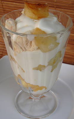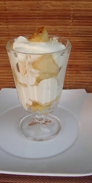 PREPARATION : Eplucher les pommes, les couper en petits morceaux et les citronner pour éviter qu'elles noircissent. Dans une poêle, avec un peu de beurre, faire revenir les pommes à feu doux pour qu'elles deviennent moelleuses. Ajouter le calvados et flamber. Dans un saladier, mélanger le mascarpone, les yaourts, le miel. Lorsque les pommes sont froides, monter la verrine : 1 couche de pommes, la préparation de crème, puis une couche de pommes, de la crème, de la meringue, et de la crème. . Servir très frais